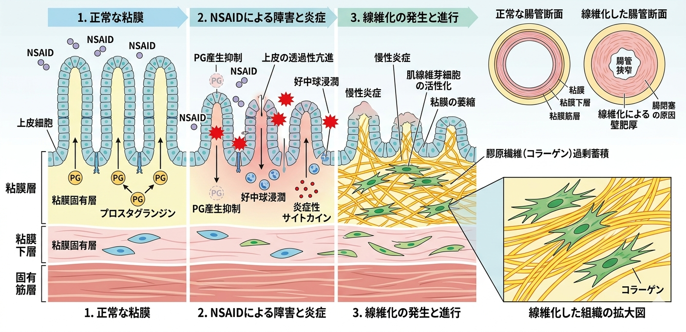 またPGは消化管粘膜を保護していています。 PGの産生低下により腸の虚血や腸管粘膜のバリア能が低下し、腸管粘膜に腸内細菌・毒素・胆汁酸などが侵入しやすくなります。その結果粘膜で炎症が起きます。炎症と改善を繰り返すことで細胞修復のために産生されるコラーゲンが線維芽細胞に吸収されず沈着し、組織の線維化が起きます。