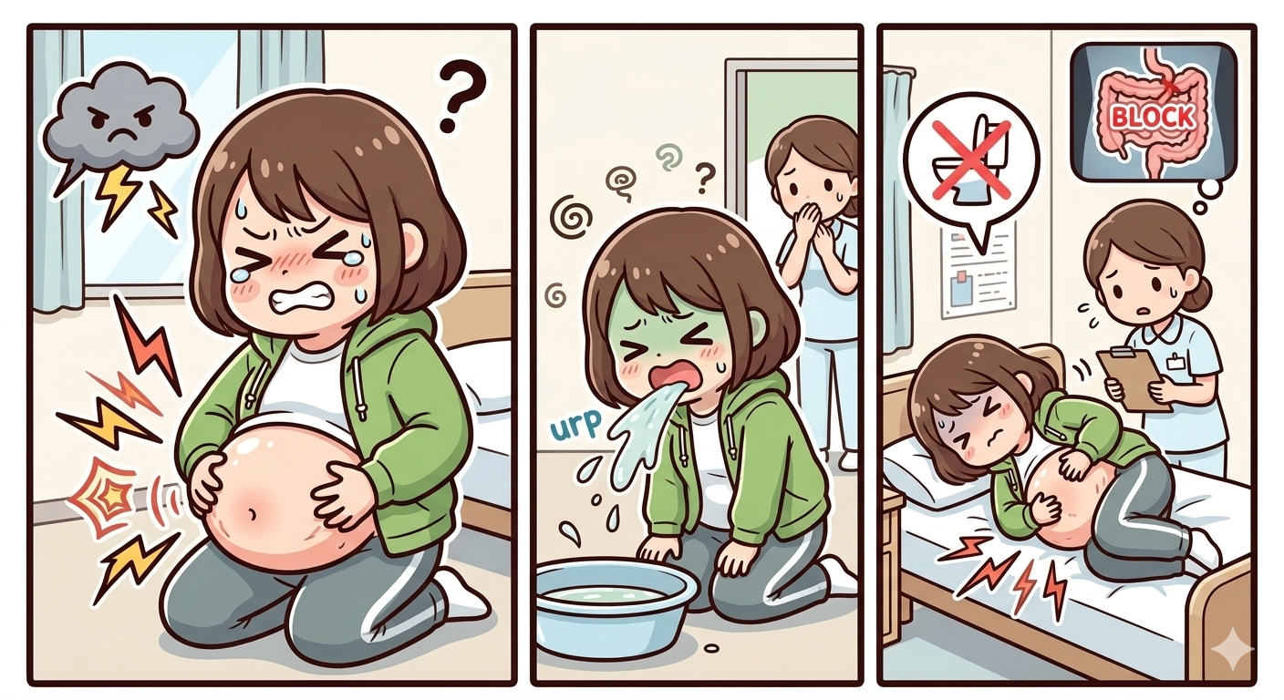 腸閉塞になると内容物が腸に滞留するため腹痛を生じます。また腸内の内容物からガスが発生し腹部膨満感も起きます。内容物の滞留により逆流が起きるため悪心・嘔吐が起きることもあります。腸が完全に閉塞してしまうと排便や排ガスが起きなくなります。