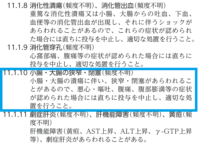 添付文書をみるとNSAIDsは腸閉塞に禁忌とはなっていません。しかし重大な副作用の項目に”小腸・大腸の狭窄・閉塞”といった記載があります。