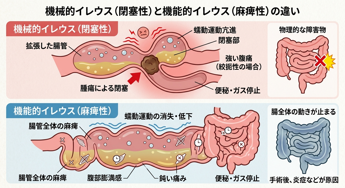 腸に器質的な異常はないですが、蠕動運動に異常が生じすることで内容物の滞留が起きるのを機能的イレウスといいます。開腹手術後などに麻酔の影響で腸管が麻痺してしまい蠕動運動が麻痺してしまう麻痺性イレウス、ストレスなどによる自律神経の乱れや、細菌・ウイルス・毒素などが原因で腸管が痙攣して内容物が流れなくなってしまう痙攣性イレウスがあります。