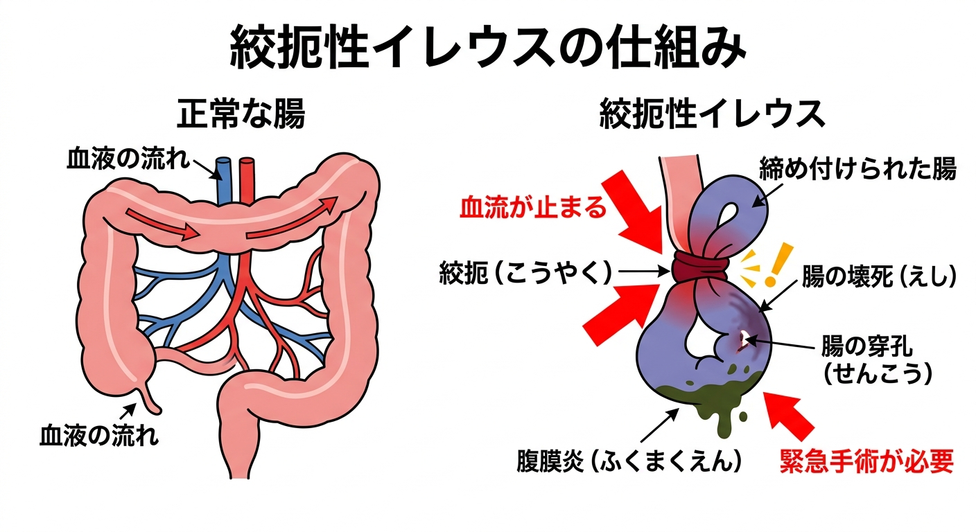 また腸が捻じれたり絞まったりする絞扼性イレウスでは急激に血流が途絶えることがあります。